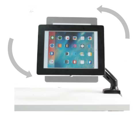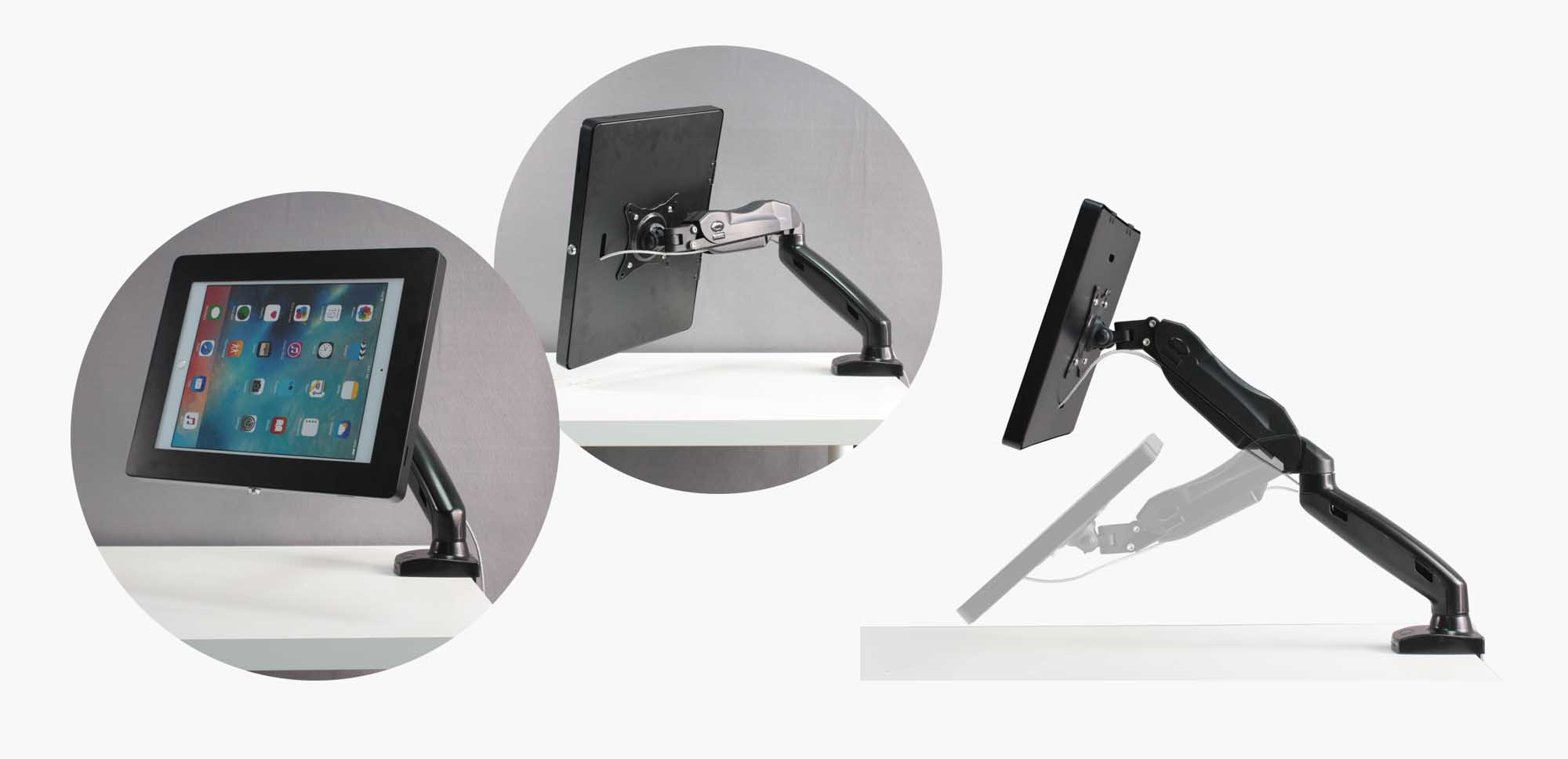 Counter Balance Arm Series is an ergonomic arm with secure tablet enclosure. Our Balance Arm stand can be securely clamped on a desk or counter-top for use as ergonomic desk companion. Compact and retractable design increase your work space. Tilt, swivel, extend and retract your iPad and tablets with a smooth gliding motion that can be easily adjusted to your liking.