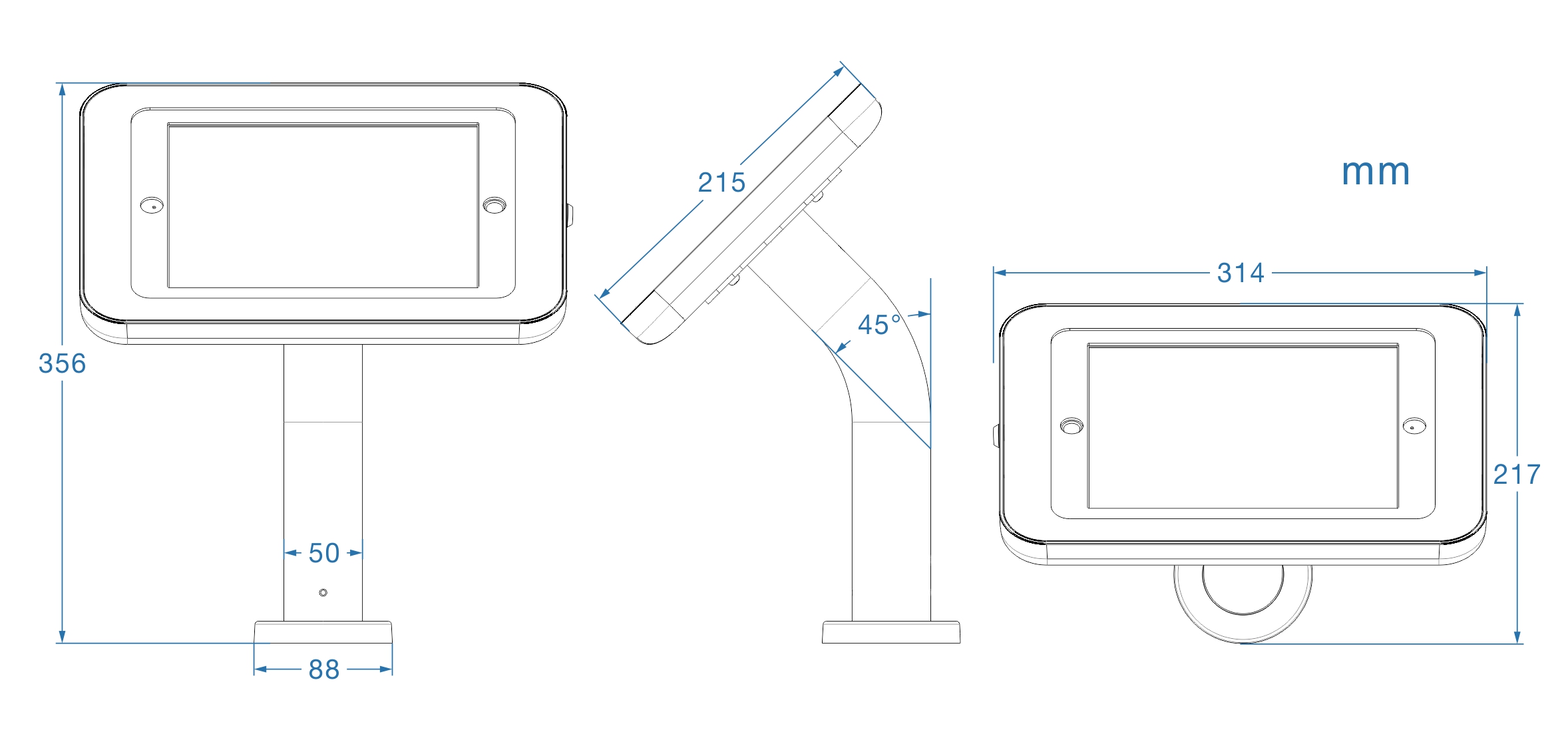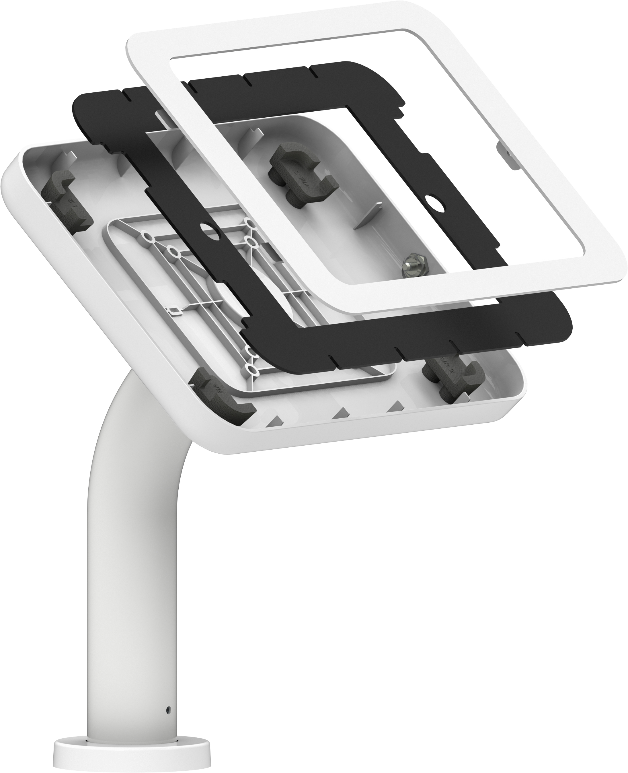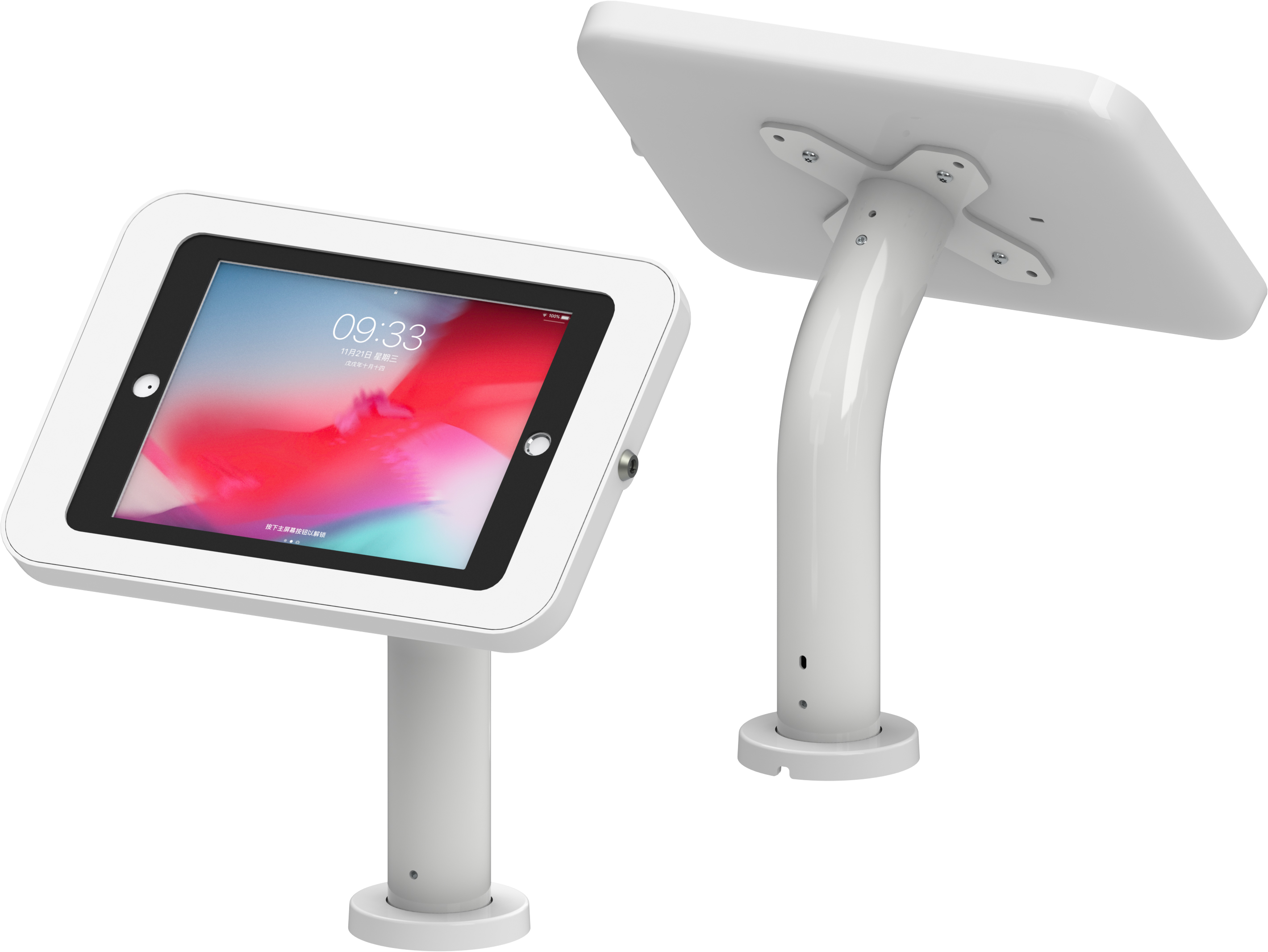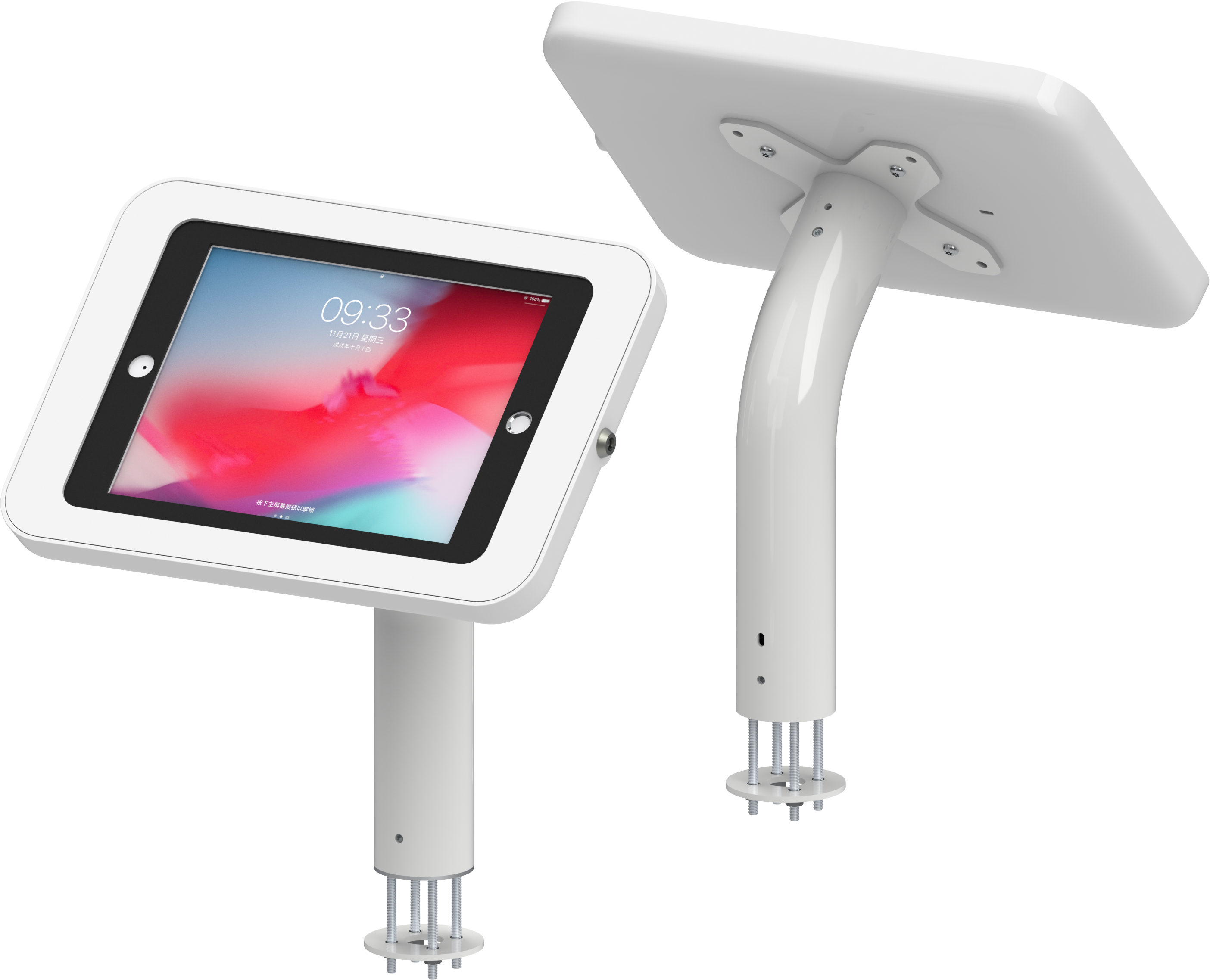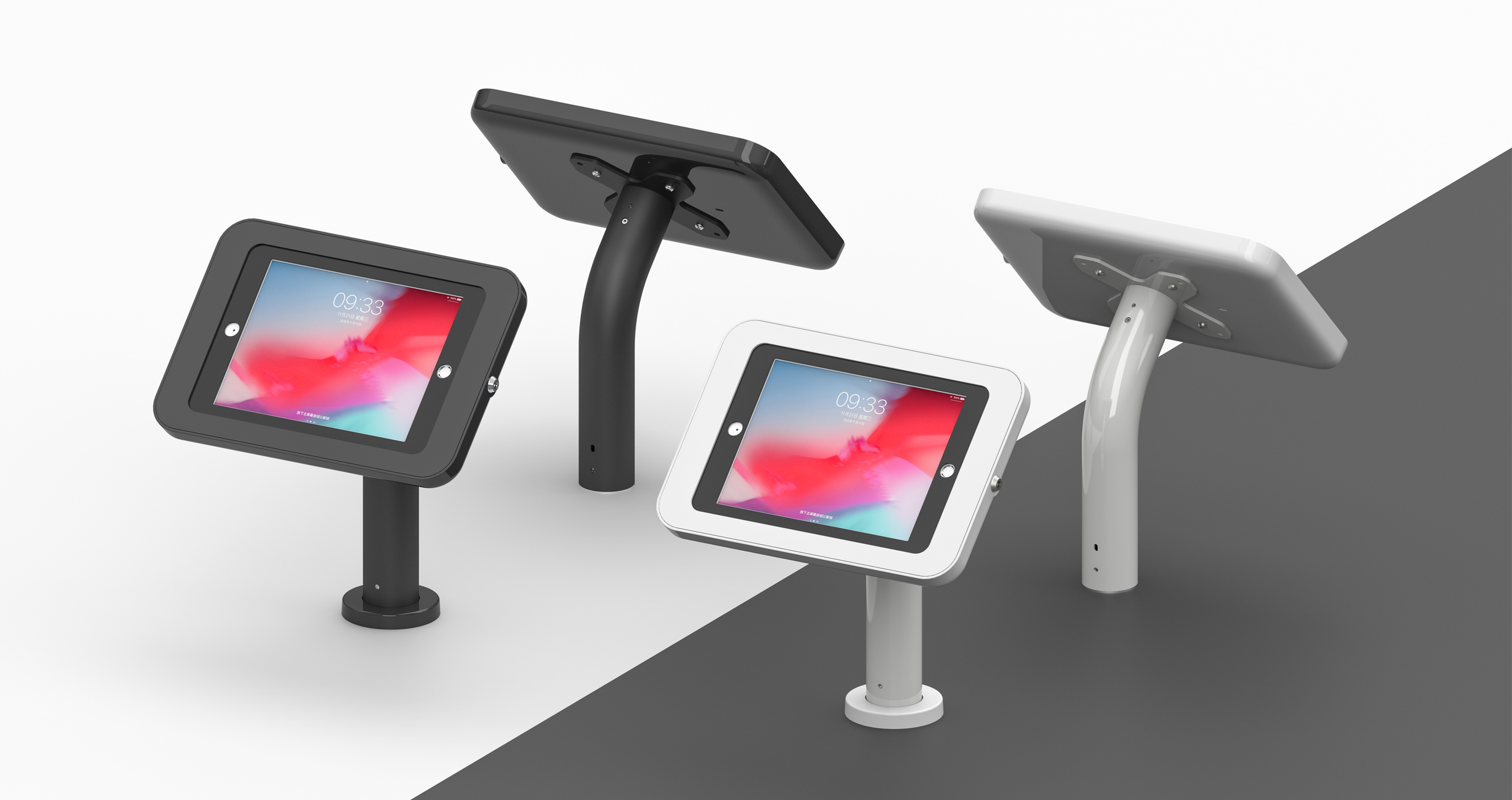 Counter Curve Pro Series is a counter surface fixed tablet kiosk stand with sleek curved neck and deluxe secure tablet enclosure. It is designed to secure tablet display directly on table, desktop surface with hidden wiring. The enclosure can be rotary 360degree easy to be portrait or landscape.