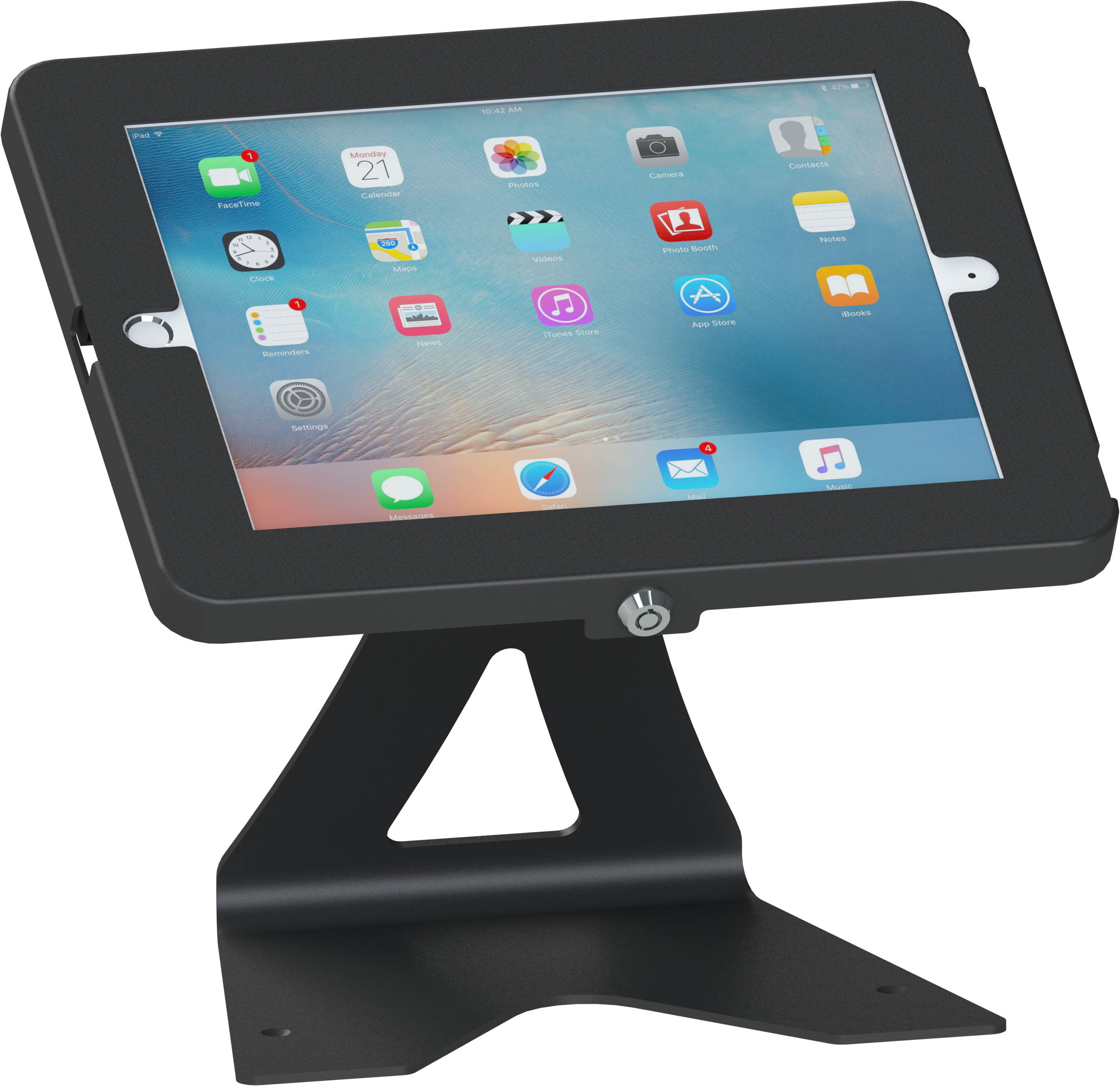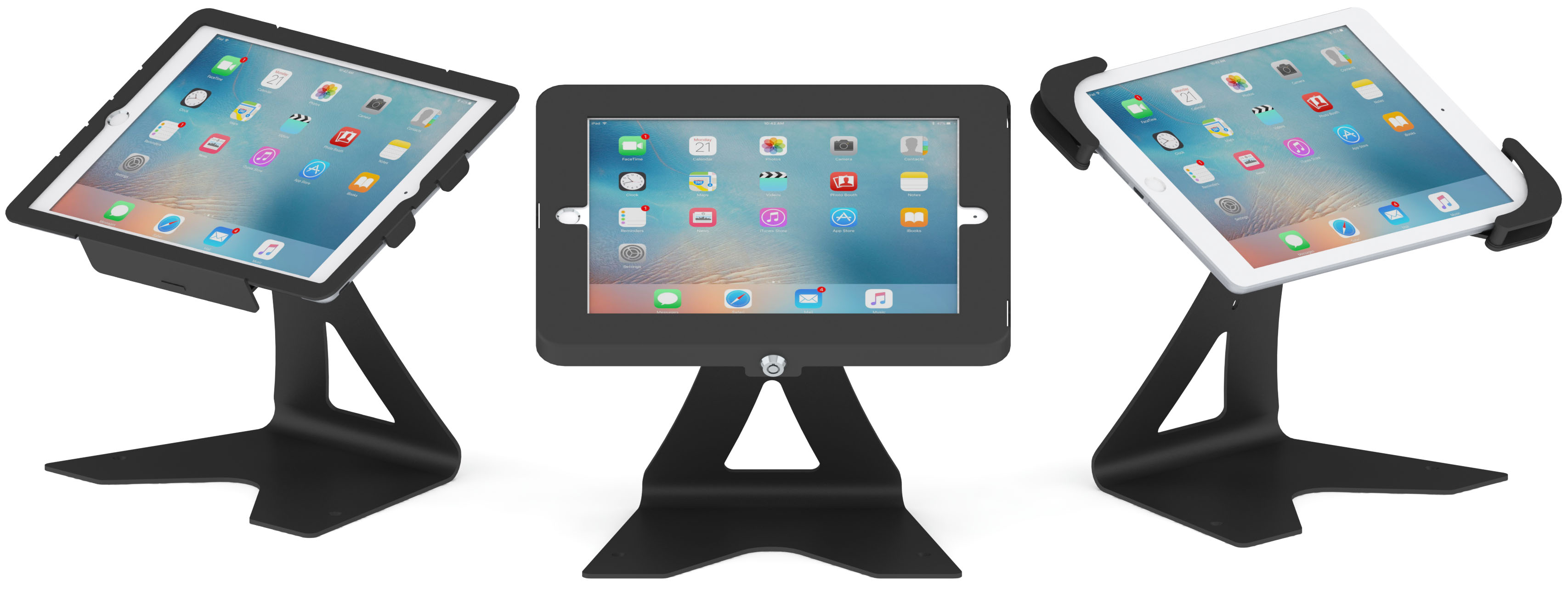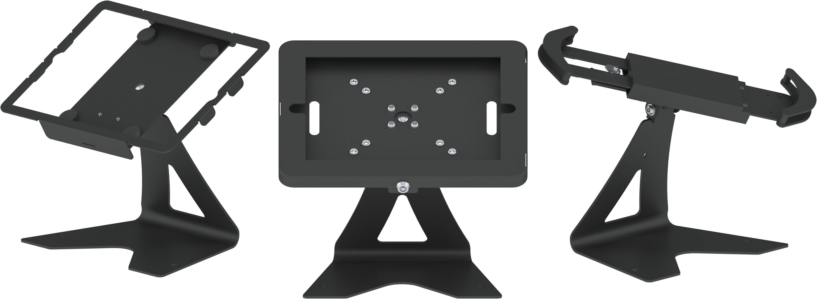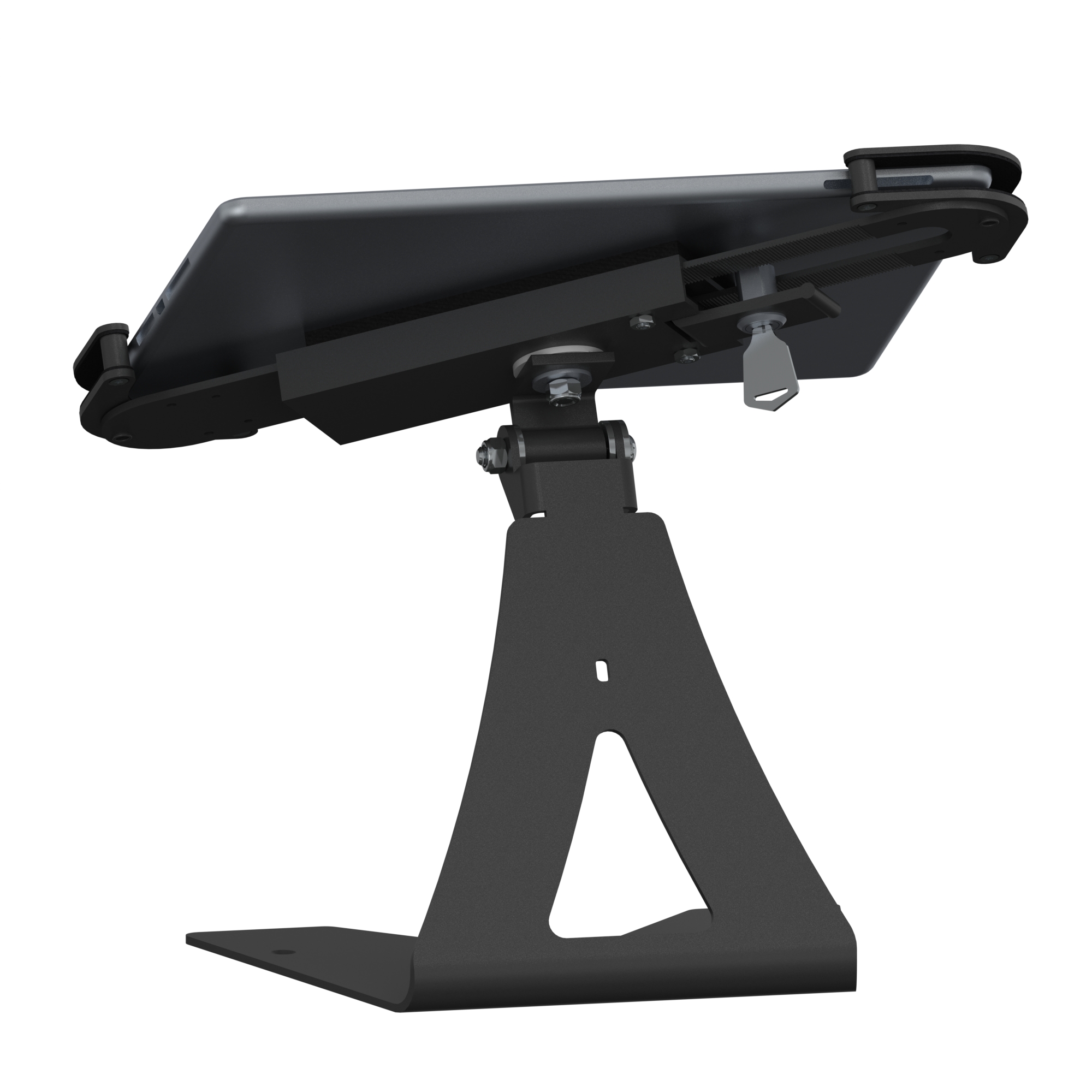 Counter Eiffel Series is a desktop secure tablet kiosk stand features a triangle stylish base inspired from the Effel tower. The stable base is made from solid metal with black powder coating. WIth rotary and tilting function it is great for any shop table or tradeshow booth. Universal enclosure choice for this series fits for most tablet pcs 7-10.1".
