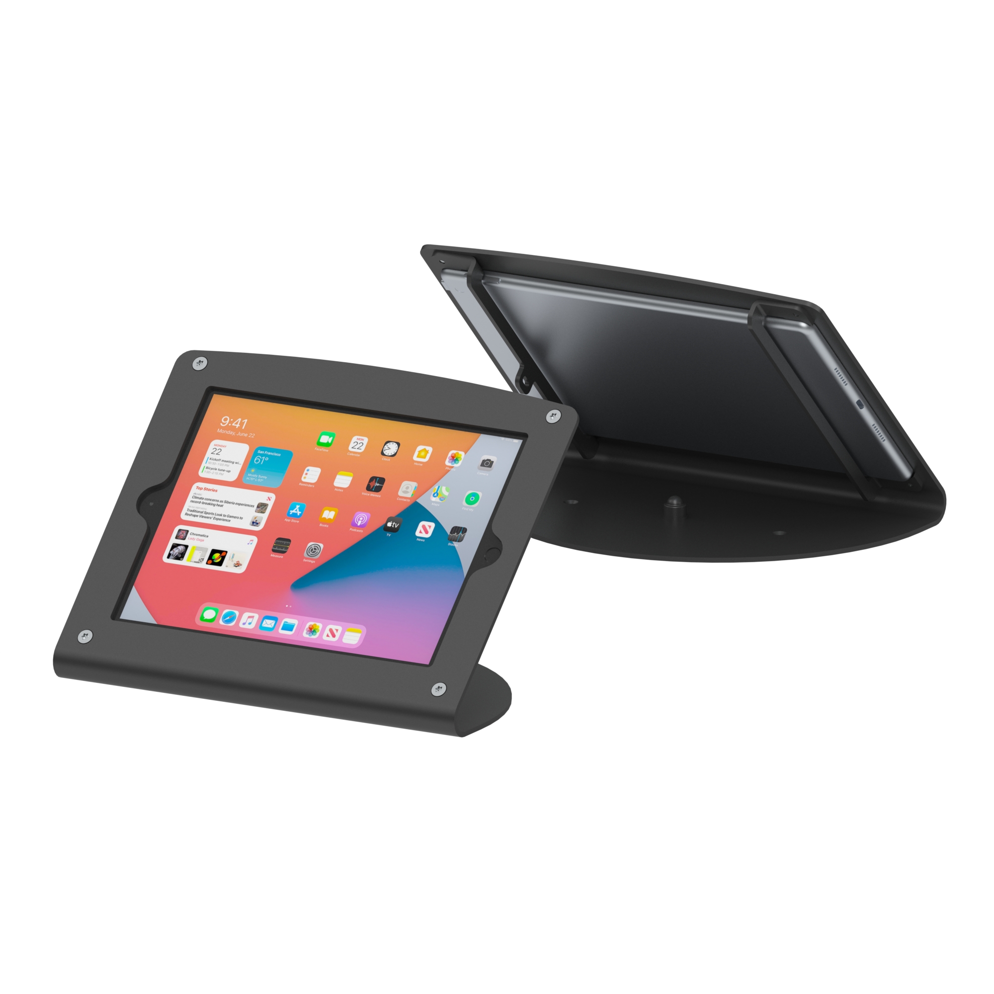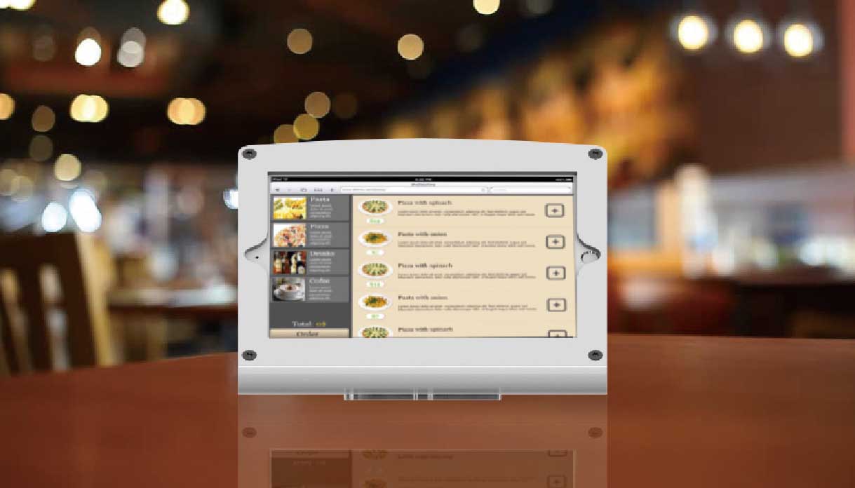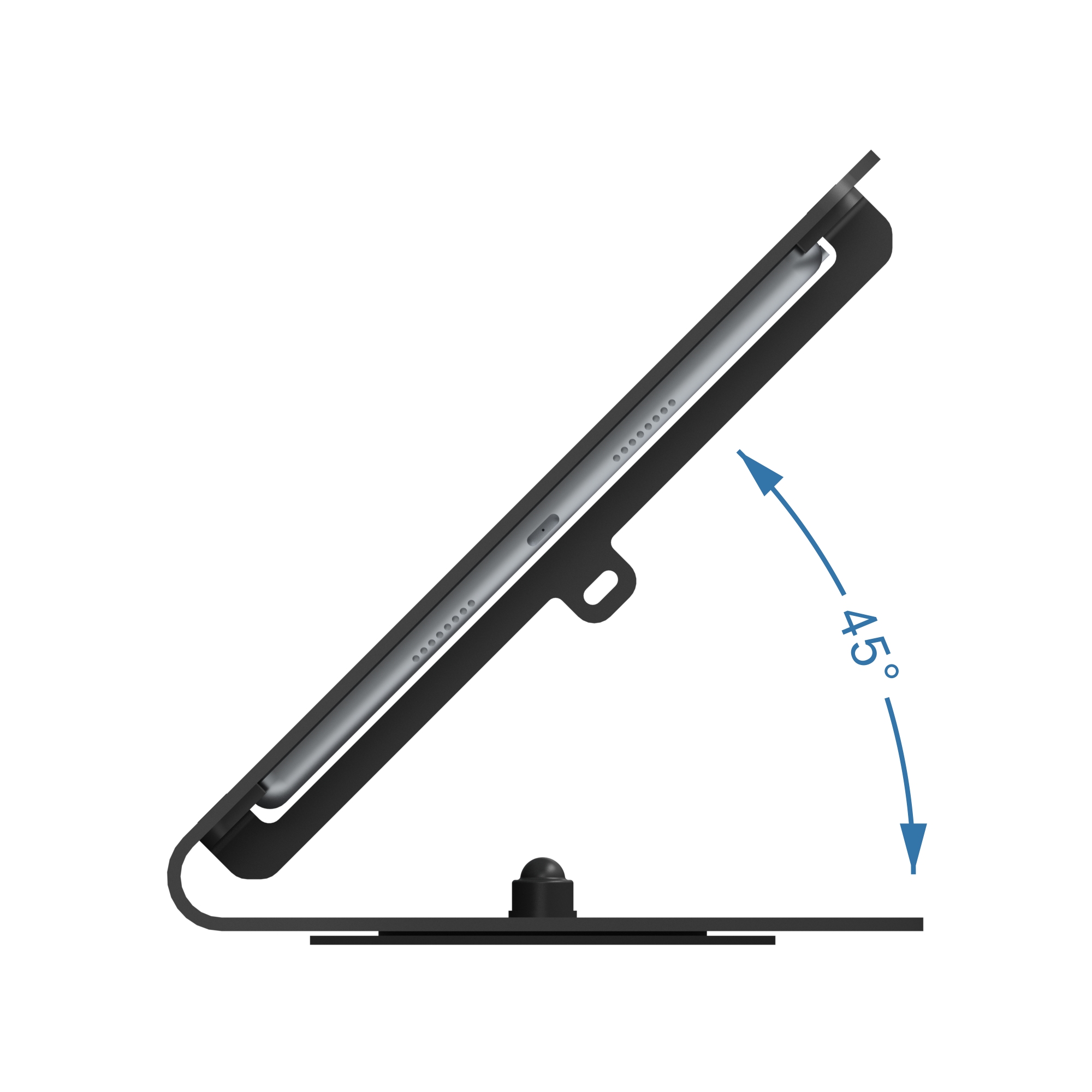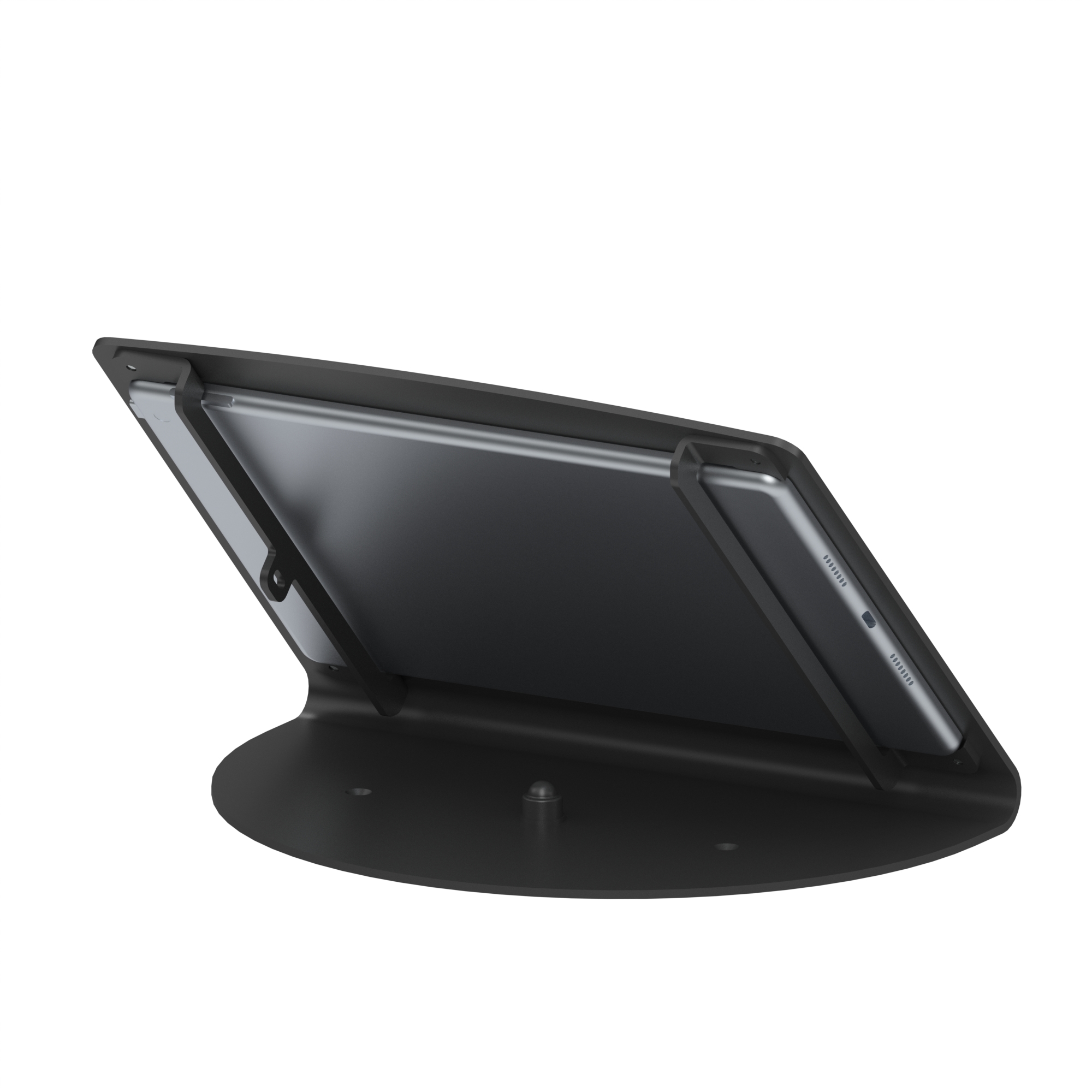 Counter Frame Series is a stylish and secure desktop iPad and tablet enclosure stand ideal for use as a free-sitting POS mount, display or secure kiosk environment. It is durable metal construction with powder coating and features a slanted L frame. Its viewing angle is ideal for content display. Compatible with credit card readers easily turn tablet PC to POS station. Mounting holes provide the choice of mounting the Frame to any surface for enhanced security. Optional Swivel Base Add-on to give swiveling ability.